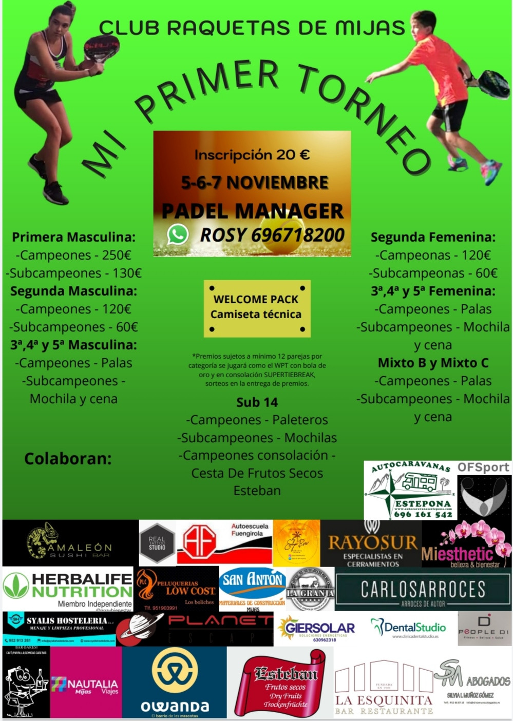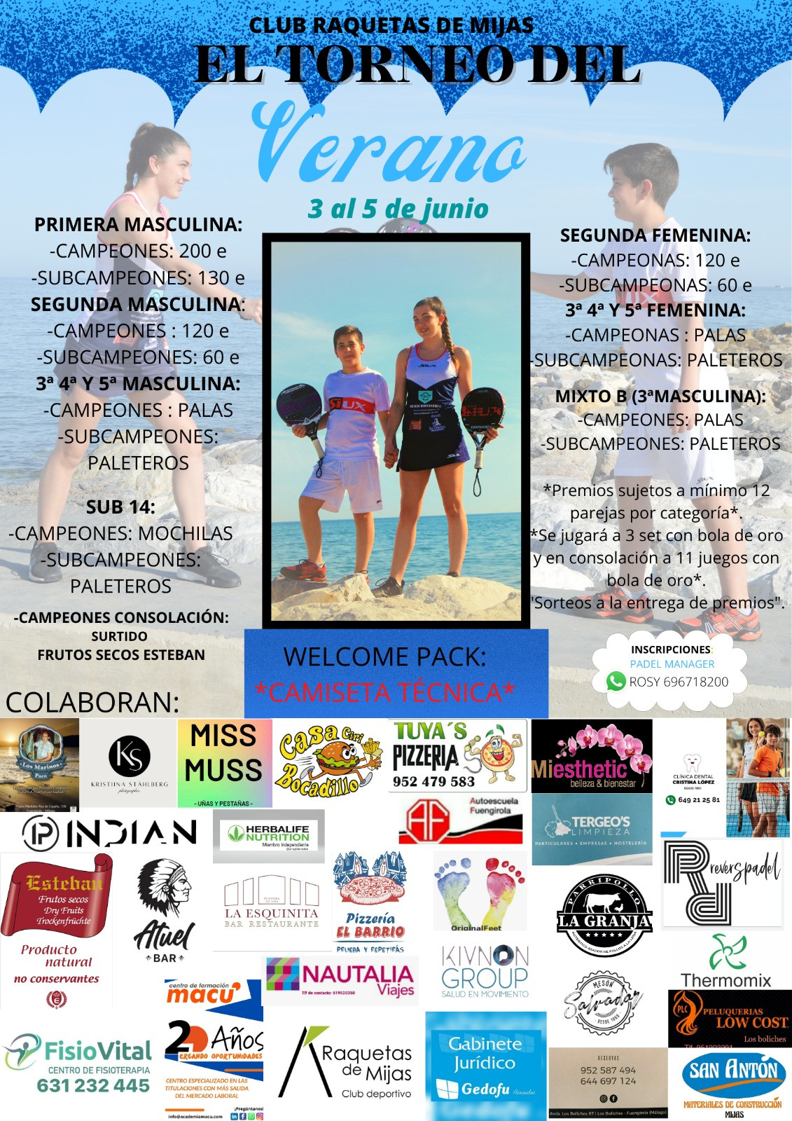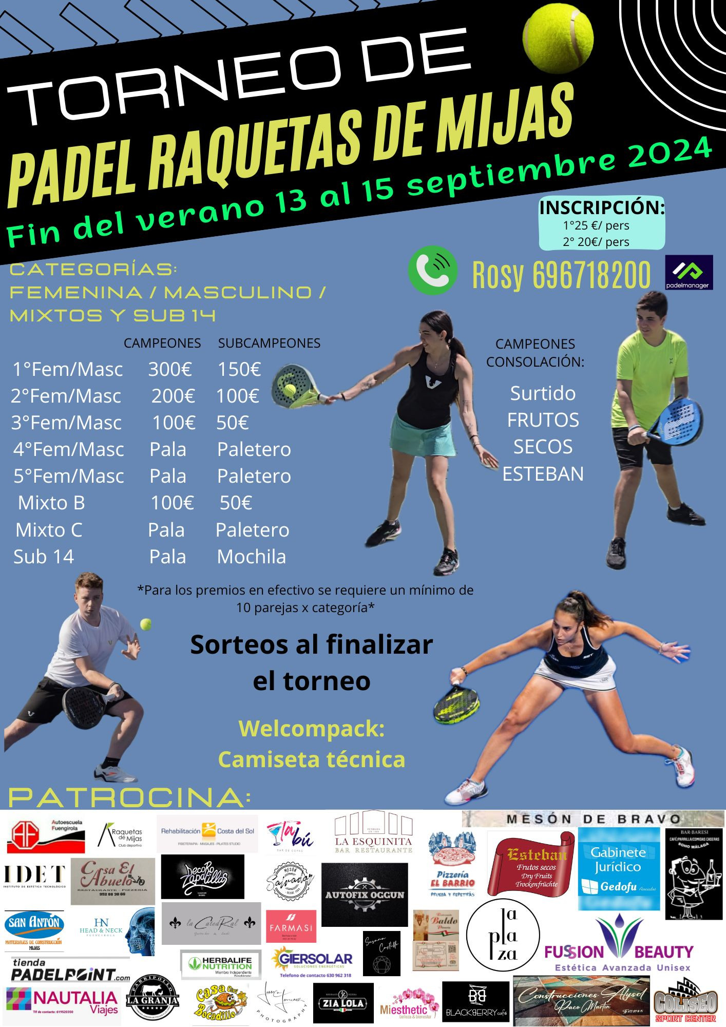 Premios: PRIMERA MASCULINA Campeones:200 Subcampeones:130 SEGUNDA MASCULINA y SEGUNDA FEMENINA Campeones:120e Subcampeones:60e TERCERA CUARTA Y QUINTA MASCULINA Campeones:PALAS Subcampeones:PALETEROS TERCERA CUARTA Y QUINTA FEMENINA Campeonas: PALAS Subcampeonas: PALETEROS MIXTO B Campeones:PALAS Subcampeones:PALETEROS SUB 14 Campeones: Mochilas Subcampeones: Bandolera CAMPEONES CONSOLACION: Surtido frutos secos esteban. PREMIOS SUJETOS A MINIMO 12 PAREJAS POR CATEGORIA. SE JUGARA COMO EL WPT 3 SET CON BOLA DE ORO Y EN CONSOLACION A SUPERTIEBREAK A 9 JUEGOS SORTEOS EN LA ENTREGA DE PREMIOS. Contacto: Rosy 696718200